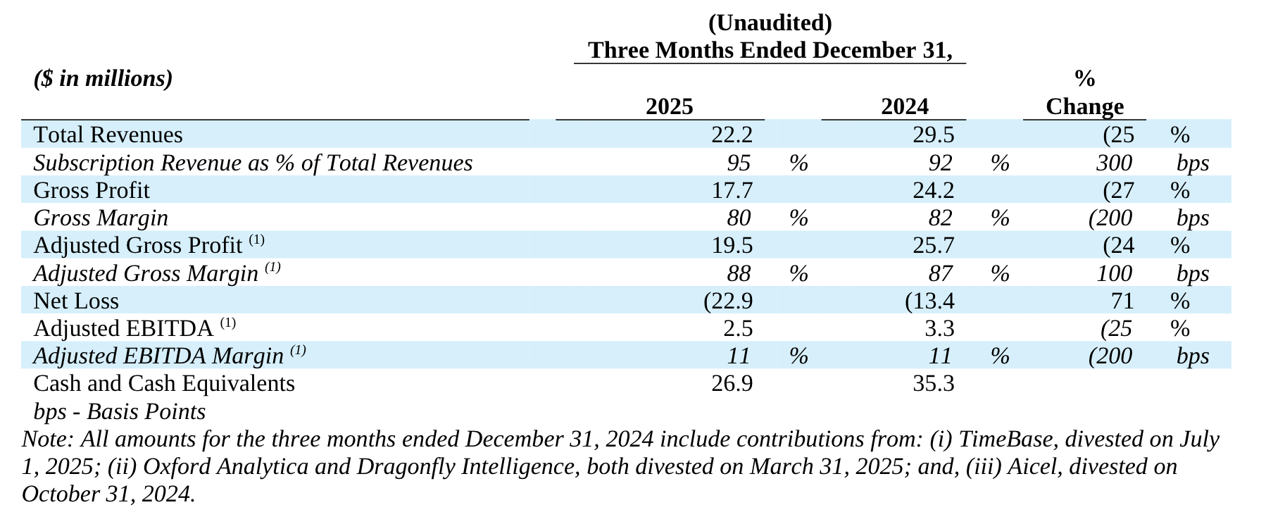 Note - All amounts for the twelve months ended December 31, 2024 include contributions from the Board.org and Aicel businesses, which the Company divested on March 11, 2024 and October 31, 2024, respectively. All amounts for the twelve months ended December 31, 2025 include contributions from Oxford Analytica and Dragonfly Intelligence, which the Company divested on March 31, 2025, and TimeBase, which the Company divested on July 1, 2025, respectively.
