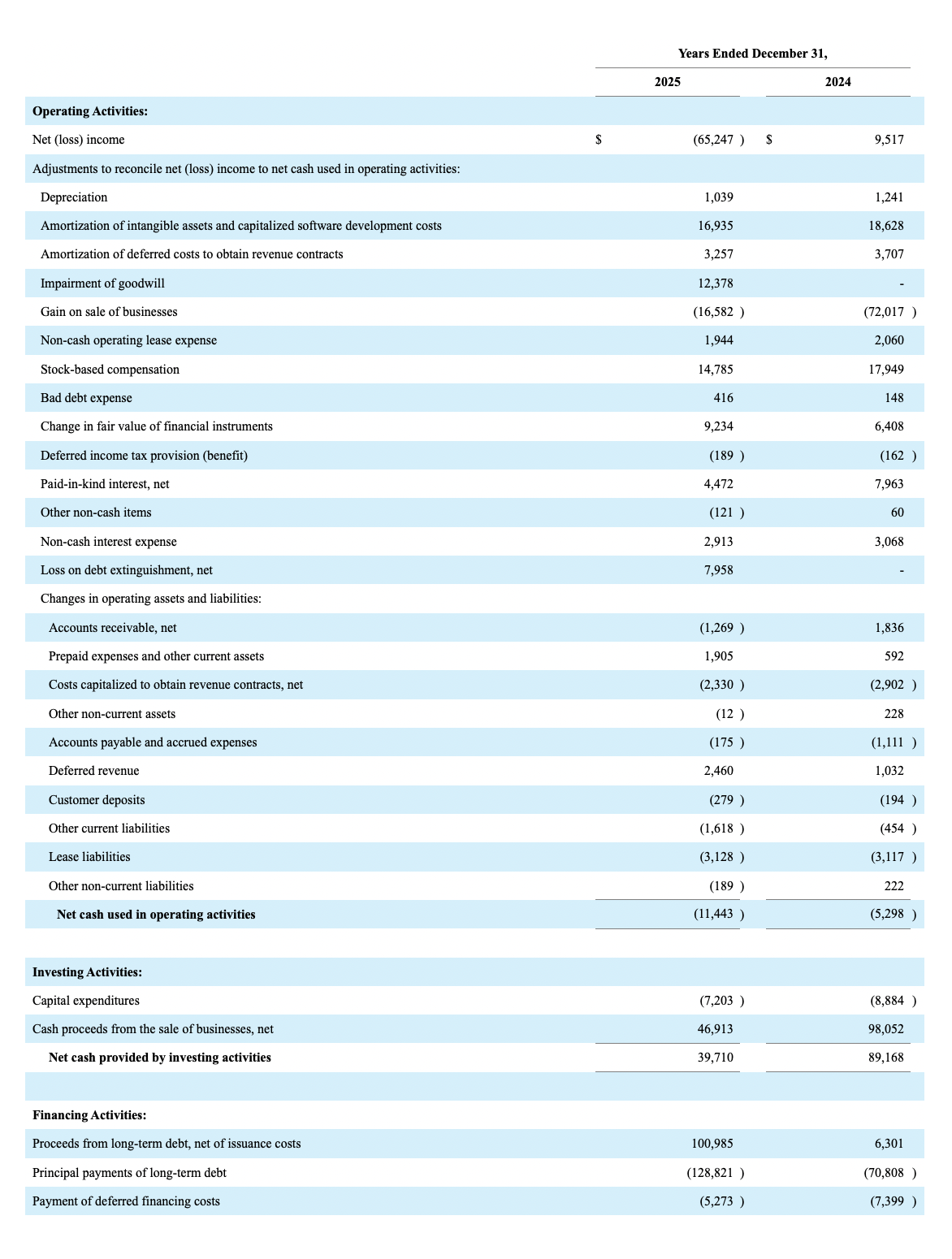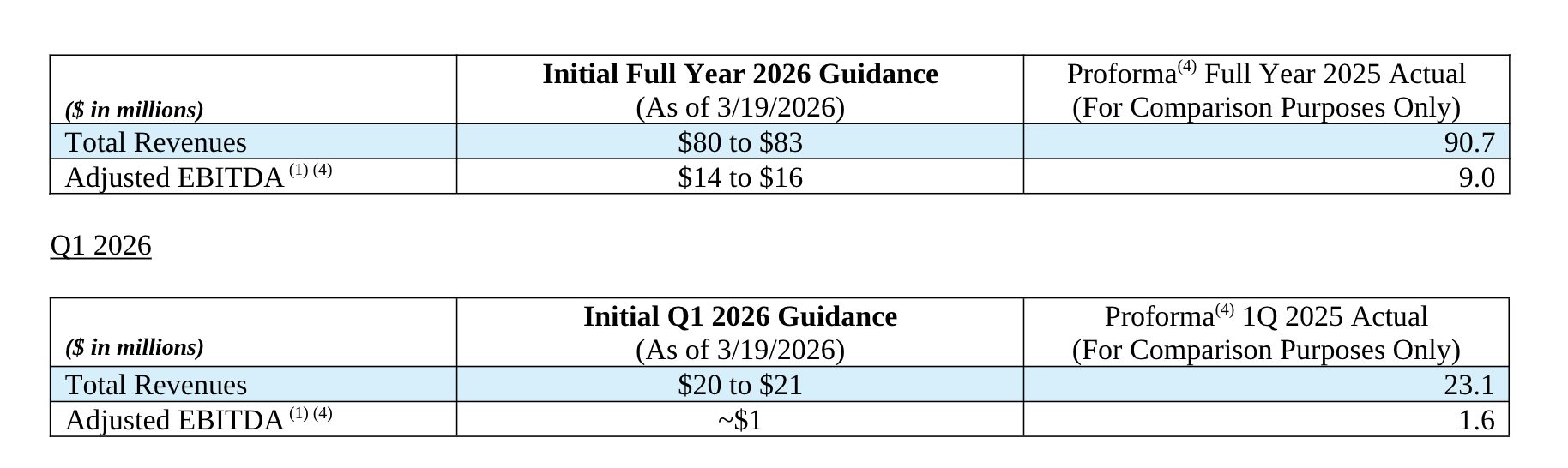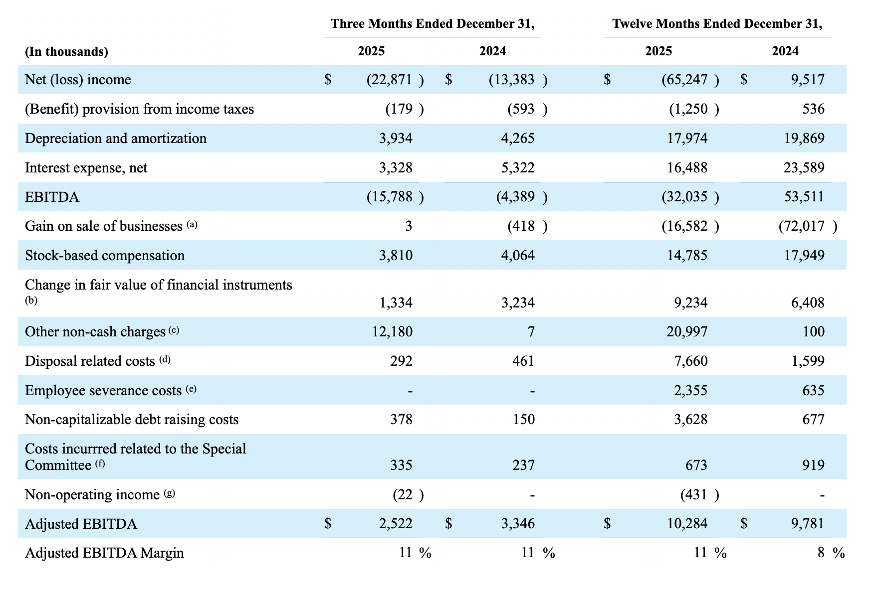 (c) Reflects the non-cash impact of the following: (i) charge of $40 in the first quarter of 2025, charge of $30 in the second quarter of 2025, a charge of $9 in the third quarter of 2025, and a benefit of $30 in the fourth quarter of 2025 related to the unrealized loss on investments; (ii) charge of $315 for fees satisfied with Common Stock of the Company during the first quarter of 2025; (iii) charge of $1,784 during the first quarter of 2025 and a charge of $6,174 in the third quarter of 2025 from the loss on debt extinguishment; (iv) gain of $170 from the release of the 2021 District of Columbia Creative And Open Space Modernization grant in the fourth quarter of 2025; (v) charge of $632 in the second quarter of 2025, a gain of $167 in the third quarter of 2025, and a charge of $2 in the fourth quarter of 2025 related to foreign currency translation losses, principally arising from converting a GBP denominated convertible note into USD, (v) impairment of goodwill of $12,378 in the fourth quarter of 2025, (vi) charge of $49 in the first quarter of 2024, charge of $31 in the second quarter of 2024, a charge of $17 in the third quarter of 2024, and a charge of $78 in the fourth quarter of 2024 related to the unrealized loss on investments; (vii) gain of $4 in the first quarter of 2024 and $113 in the fourth quarter of 2024 from the change in fair value related to the contingent consideration and contingent compensation related to the 2021, 2022, and 2023 Acquisitions; (viii) gain of $530 from the release of the 2020 District of Columbia Creative And Open Space Modernization grant in the fourth quarter of 2024; and (ix) charge of $572 for fees satisfied with Common Stock of the Company in the fourth quarter of 2024.