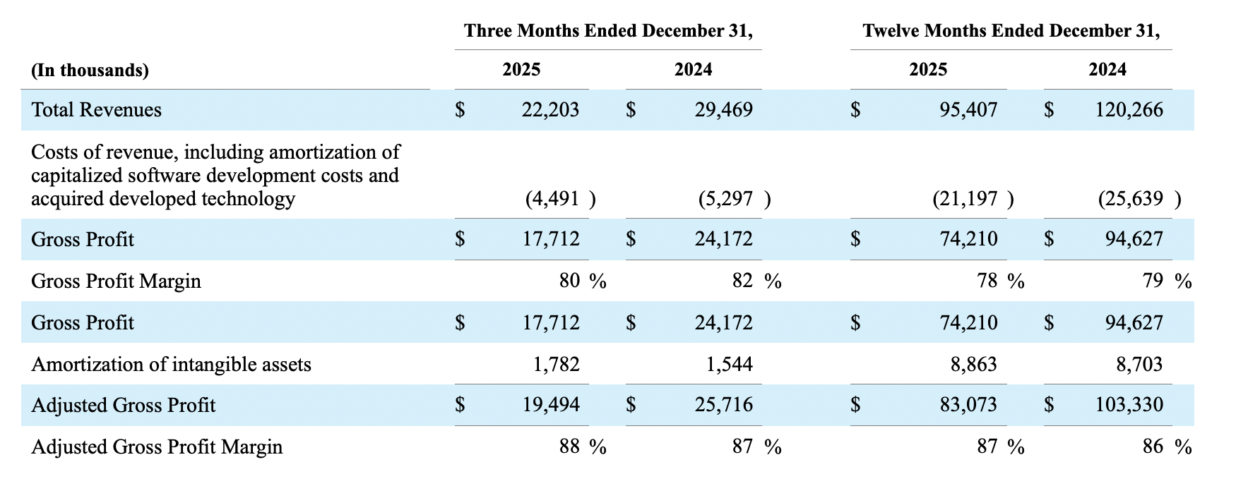 We define Adjusted Gross Profit as Total revenues minus cost of revenues, including amortization of capitalized software development costs and acquired developed technology, before amortization of intangible assets that are included in costs of revenues. We define Adjusted Gross Profit Margin as Adjusted Gross Profit divided by Total Revenues.