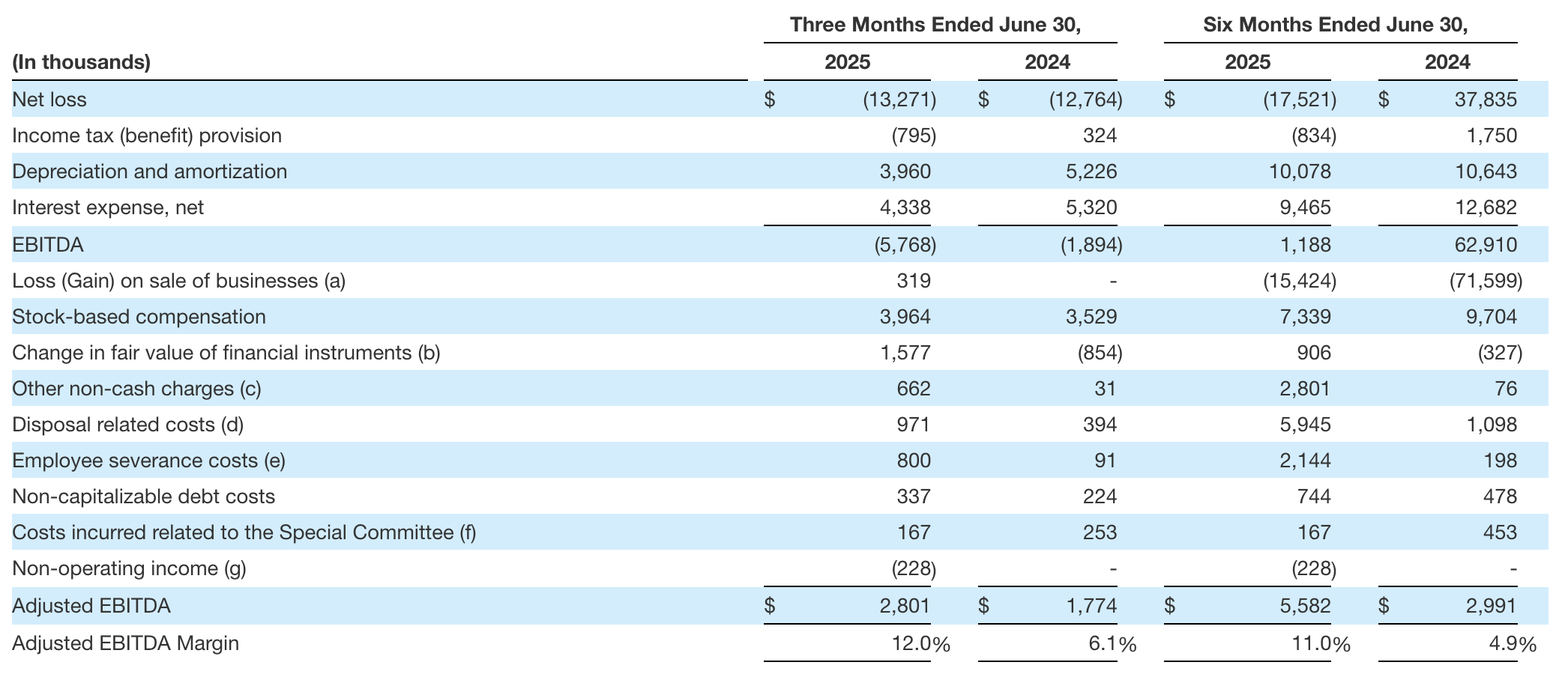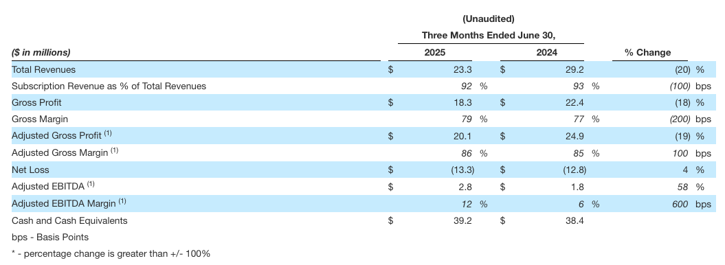 For Q2 2025, the Company reported $23.3 million in total revenues and $2.8 million of adjusted EBITDA(1), with revenue above the guidance midpoint and adjusted EBITDA exceeding guidance. This performance reflects the impact of business divestitures and product sunsetting. The performance also reflects the benefit of expense management and efficiency initiatives previously put in place, which are resulting in improving operating leverage and expanding adjusted EBITDA and adjusted EBITDA margins. On a year-over-year basis, adjusted EBITDA improved by 58%(1), and adjusted EBITDA margins(1) doubled.