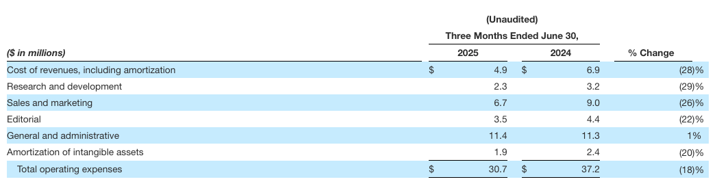 In Q2 2025, total operating expenses declined $6.5 million, or 18%, versus prior year, due primarily to the previously announced divestitures, ongoing efficiency measures and operating discipline initiatives, and the elimination of costs associated with sunset products.