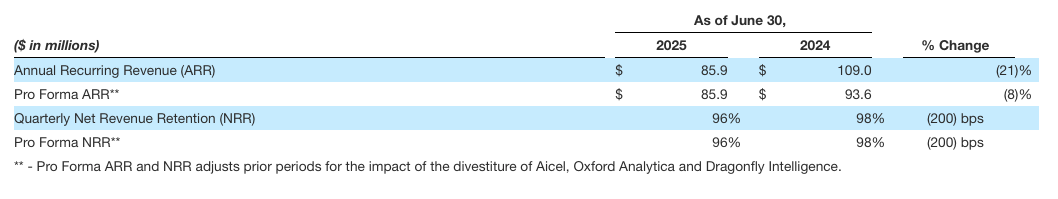 As of June 30, 2025, ARR, on an as reported basis, declined $23.1 million, or 21%. On a pro forma basis (excluding the divested businesses Aicel Technologies, Oxford Analytica, and Dragonfly Intelligence) ARR declined $7.7 million, or approximately 8%. This decline is principally due to previously known execution challenges leading into and impacting the first half of the year, customer engagement issues in the Company’s legacy products, and atypical instability in the US federal sector. The Company has been addressing these issues through operational improvements in its private and public sector go-to-market teams and approach, as well as the launch of – and migration of customers to – its new PolicyNote platform. It is now seeing improvement in relevant pipeline and sales metrics in addition to rising strength in customer engagement metrics.