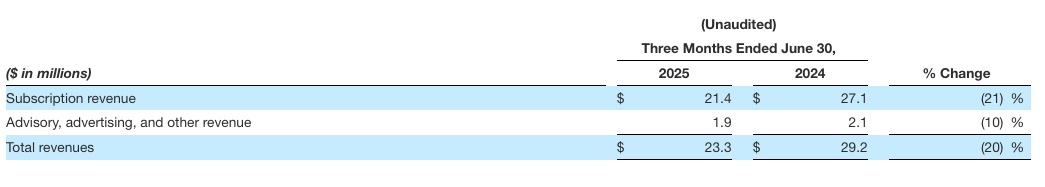 For Q2 2025, advisory, advertising, and other revenue declined $0.2 million, or 10%, versus prior year, due primarily to the discontinuation of certain non-strategic products.